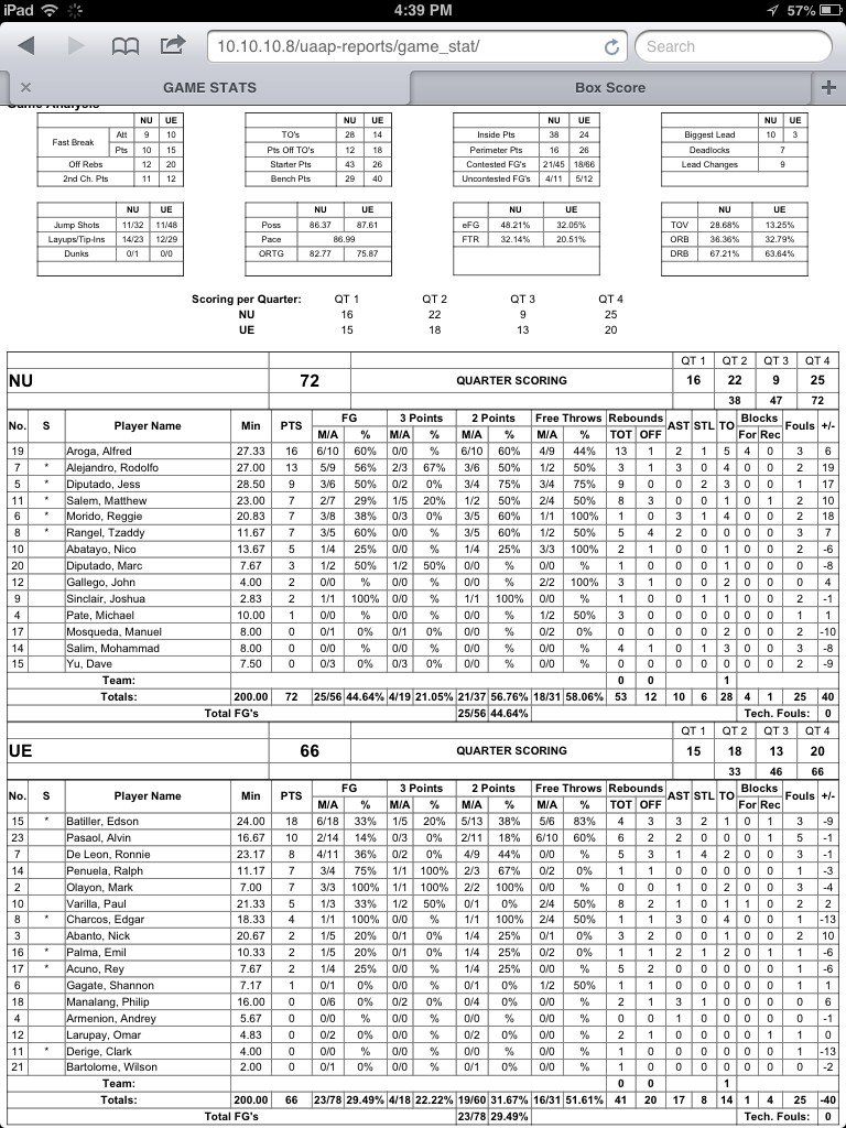 Alfred Aroga (NU) - 16pts, 13rebs, 2asts, 1stl, 4blks, 6/10 FGs.